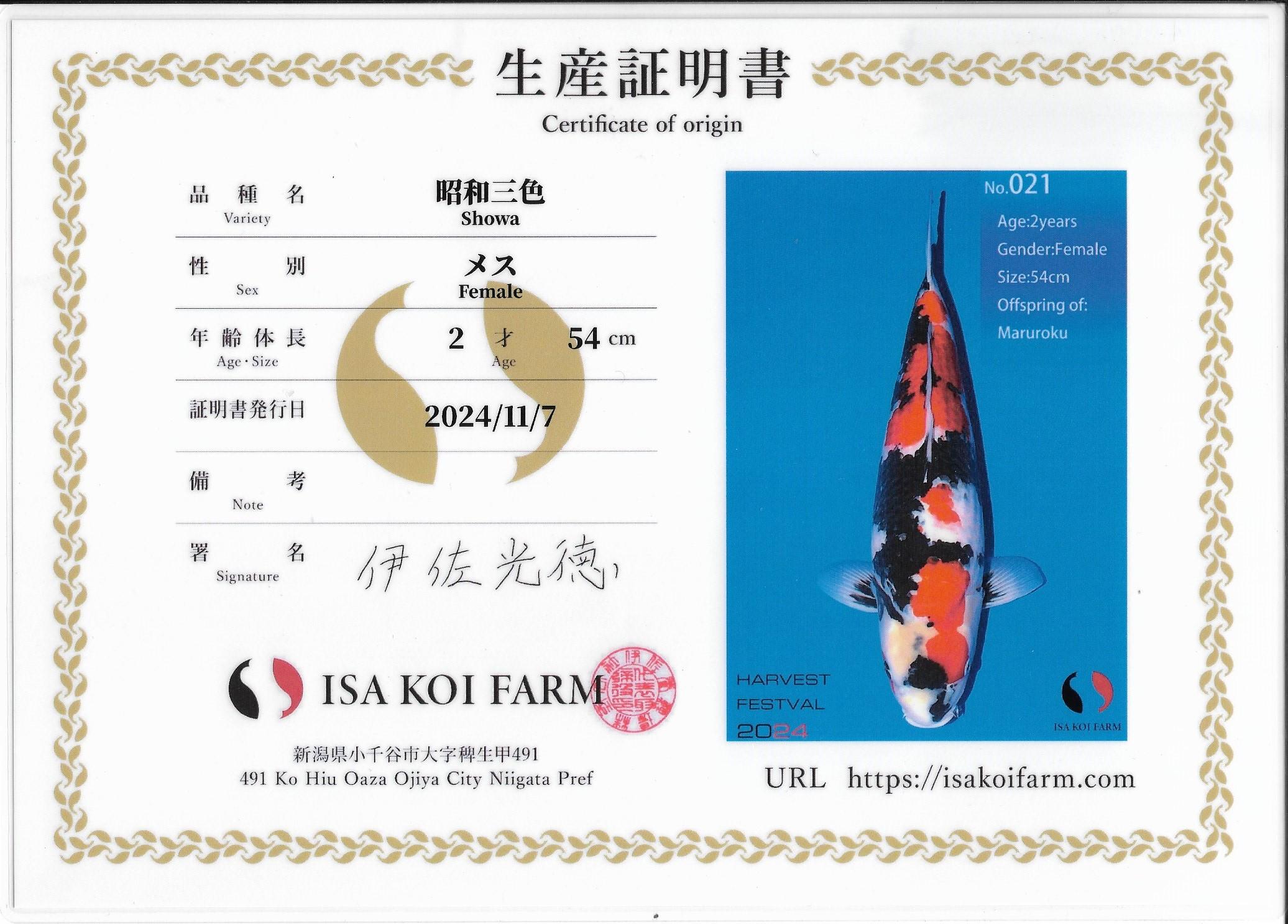 Note:Super Nisai Showa from Isa Koi Farm, Offspring of Maruroku. Super Skin Quality, Strong Body, & Beautiful Pattern. We got this fish from Isa Live Auction.